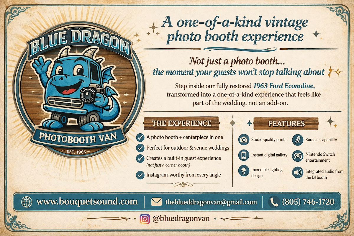 Make your wedding unforgettable with a vintage photo booth van in Ventura & Los Angeles. The Blue Dragon creates a fun, interactive experience your guests will love.